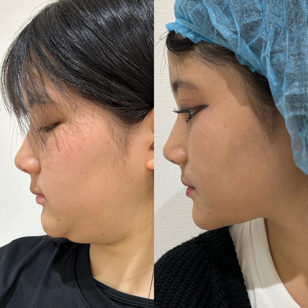 口横のもたつき、頬骨下のこけが気になるとのこと。もたつきの部分は脂肪吸引で軽減させ、糸リフトで引き上げて凹みの部分にボリュームを移動することで、卵型の輪郭形成を目標に行いました。