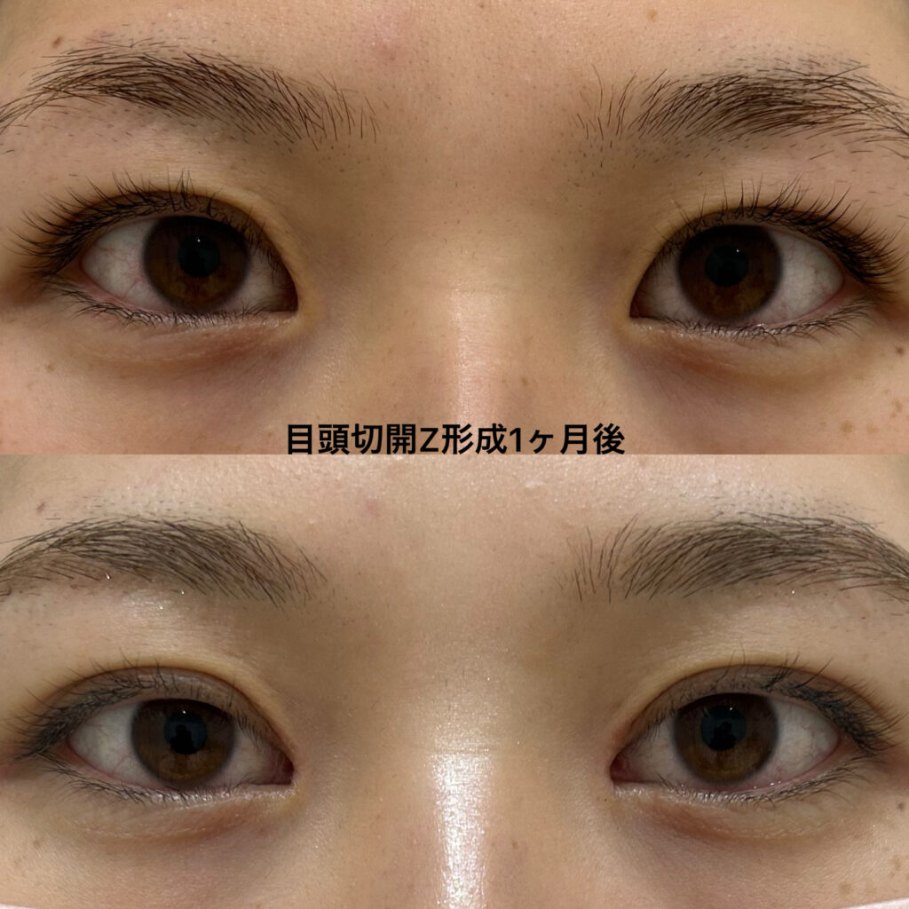 目が離れた印象を改善したく目頭切開を行いたいとのことでした。Z形成で横向きの変化を大きくして尖った目頭とし離れ目の印象を改善しました。