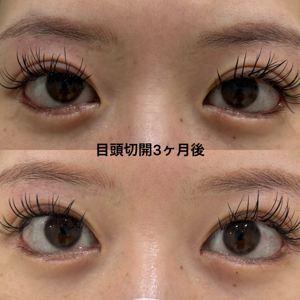 蒙古襞の張り、目と目の間の距離が気になるとのことで、目頭切開を行いました。このように内側に傷を寄せて行えば目頭切開の傷は限りなく目立ちにくいかと思います。